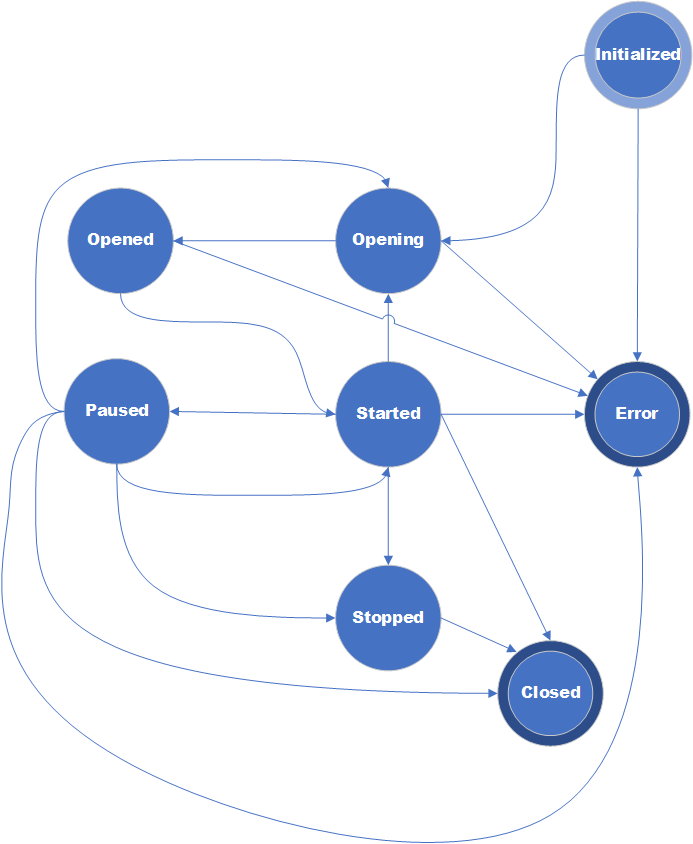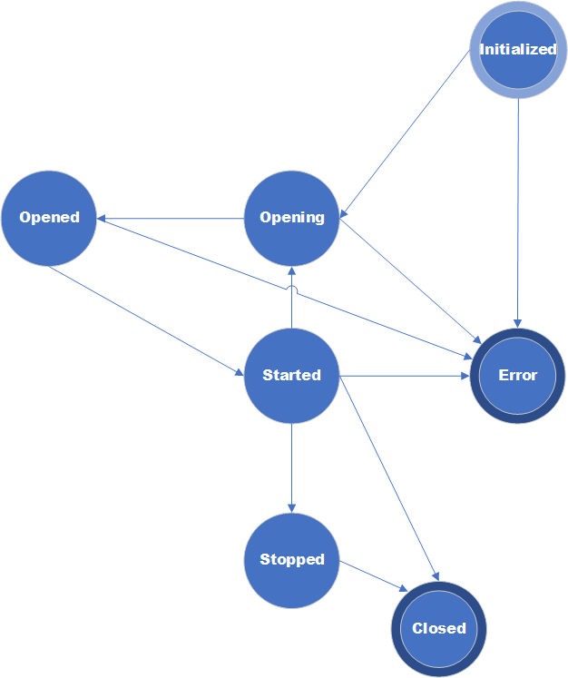 After reaching the Opened state, you can start the object by calling Start(). Calling Start() while the object is in Initialized or Opening state throws an exception.
